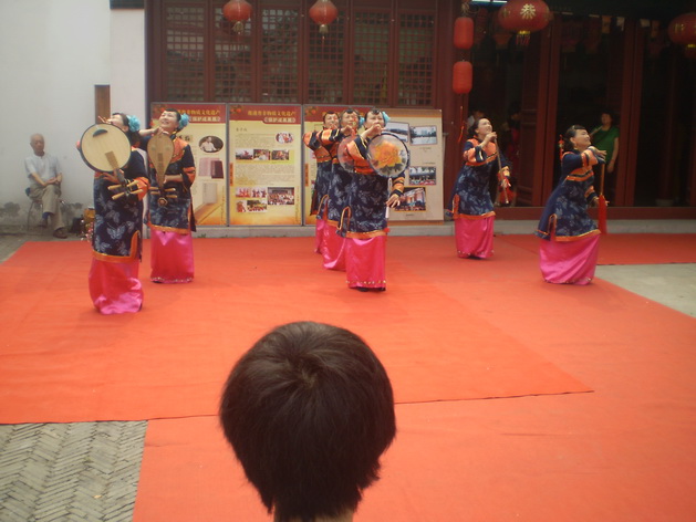 为了活跃气氛,易家桥社区侨友艺术团的演员,身着以南通蓝印花布为主料的民族服装,演奏古典乐器,展示古代服装。受到了群众的好评。
