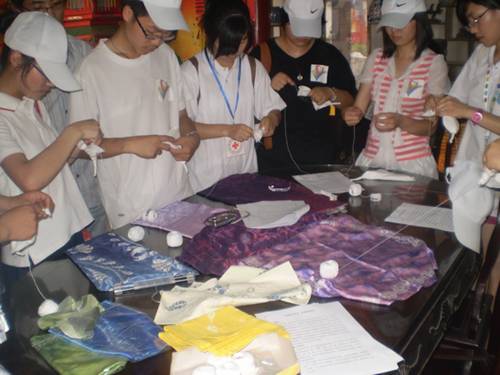 该活动以蓝白风韵、紫气东来为主题,主要向青少年学生展示了辖区的民间收藏成果及非物质文化遗产保护情况。活动邀请了南通市蓝印花布扎染专家戴晓晔、邵凡,如东捏面人专家罗斌等非物质文化遗产继承人现场表演,并对学习者给予指导。南通大学的学生们认真听讲,并在专家的指导下,积极的参加了蓝印花布的染色工艺制作,南通大学纺织服装学院服装设计与工程专业、非织造材料与工程专业的学生还对传统的布料扎染工艺同现代染色工艺从不同角度做了比较,并表示要在今后的学习中加强对该传统的重视与学习。