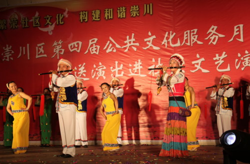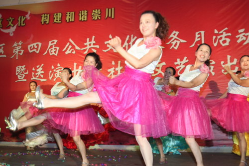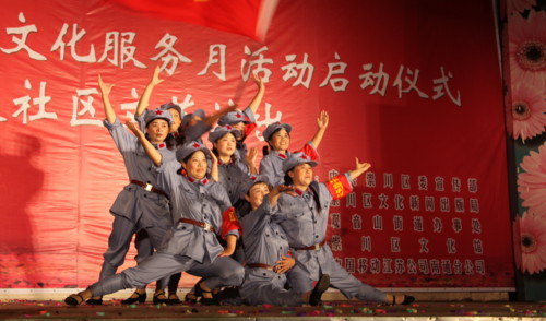 随着黄书记宣布崇川区第四届公共文化服务月活动正式启动,“送演出进社区”文艺演出拉开帷幕。舞蹈《让我们舞起来》、葫芦丝与巴乌演奏《情深意长》让人感受到崇川人民快乐、幸福的生活;号与舞《映山红》、舞蹈《再唱山歌给党听》向建党90周年献礼;小品《绿色进行曲》、通剧《创建和谐新社区》反映社区新貌、宣传文明创建。演出中还穿插了精神文明建设相关知识问答,中国移动南通分公司市区营销中心为答出问题的观众提供了丰厚奖品。