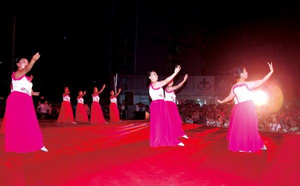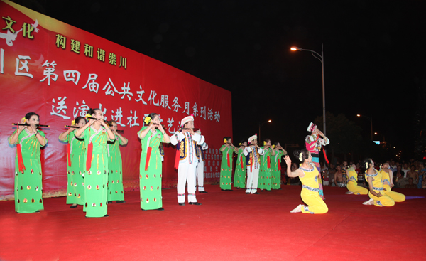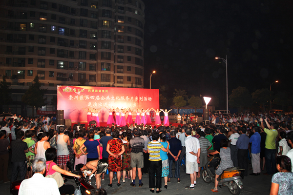 727730,我馆送演出进社区文艺演出第五场在文峰街道凤凰莱茵苑举办。在《祝福祖国》舞蹈的歌声中,本场演出拉出序幕。本场演出约1个半小时,近百名社区居民观看了这场演出。演出得到了居民的一致欢迎,上图为演出时的照片。
