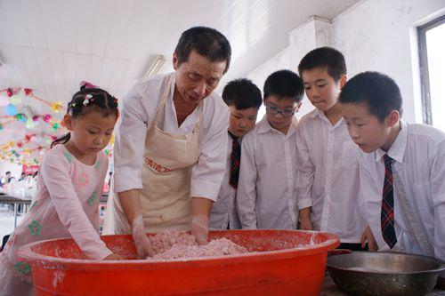 活动现场张灯结彩,孩子与老人们围坐一团,欢声笑语,处处洋溢着喜庆的节日气氛。两位小主持人精彩的开场白,拉开了活动的帷幕。活动特别邀请了南大街老字号四宜糕点店的孙师傅,为老人和孩子们讲述重阳节做重阳糕、插重阳旗、品重阳糕、登高赏菊等习俗的由来,孩子们听得津津有味,与孙师傅现场互动。在孙师傅精心讲解和指导下,同学们有模有样地学起了制作重阳糕,揉粉、搓面、加豆沙、蜜枣等每一个步骤,同学们亲手体验,不一会就有两块大糕被送上了蒸架。