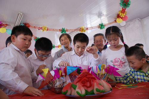 很快,香气扑鼻、热气腾腾的重阳糕出炉了。同学们与老人们一起,用重阳糕摆出了“福”、“寿”字,糕点师傅还现场制作了寿桃,祈福老人们健康长寿。孩子们与老人共同一起做重阳旗,写上对老人们的祝福,并将重阳旗插到摆好的“福”、“寿”、“桃”上,共同感受“重阳节里重阳糕,糕不为其旗为其”这句俗语的深刻含义。