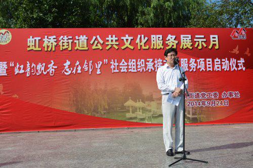 9月24日下午,虹桥街道和文化馆一起展示月系列活动之“虹韵飘香志在邻里”暨社会组织承接志愿服务项目启动仪式活动在虹桥公园文化广场举行街道党工委书记高峰为活动致辞。多年来,虹桥街道注重文化社团建设,推动了各种群众文化活动朝气蓬勃的开展,赢得了老百姓的支持与参与。目前,街道共培育木兰艺术团等文化团队100多支,开展了以“激情虹桥”为品牌,以社区文化艺术节、民俗文化展示节、邻情街韵风采节、文化惠民社区行“三节一行”为主题的文化活动近千场,形成了以社区、邻里为主阵地,社区干部积极引领,党员群众热情参与,文化团队大力支持的整体文化发展氛围。