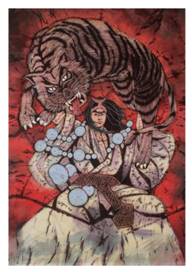 几年过去了,人们都知道了船工娶画上的美女结为妻子的事。这天,县官来到渡口,见船工的妻子貌美,想霸占为妾。船工的妻子见县官起了歹意,便收了凡身,回到画上。县官抢走了画并把画贴在了床头。可是,不管县官怎样甜言蜜语,画上的美人就是不下来。 小虎在家一直哭着要妈妈,送画的老奶奶告诉船工,让小虎的姑姑做双虎头鞋,小虎穿上它,就一定能够找到妈妈。按照老奶奶的嘱咐,小虎的姑姑连夜做好了虎头鞋。小虎穿上一试,身轻如燕,立刻向县衙飞去。见了县官,虎头鞋变成了老虎,咬死了县官。船工的妻子见小虎来救她,赶忙从画上跳下来,带着小虎高高兴兴地回家了。人们认为虎头鞋能除恶魔保平安,因此都要给孩子做双虎头鞋穿。