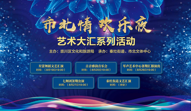 2020年8月19日至2020年8月31日,以“市北情 欢乐夜”文艺大汇为主题,围绕青春、活力、健康、快乐、正能量开展的一系列文化活动在市北文体中心楼前广场举行,舞蹈、器乐、歌曲等各种艺术表演形式精彩纷呈。演出现场掌声阵阵,气氛热烈,精彩不断。