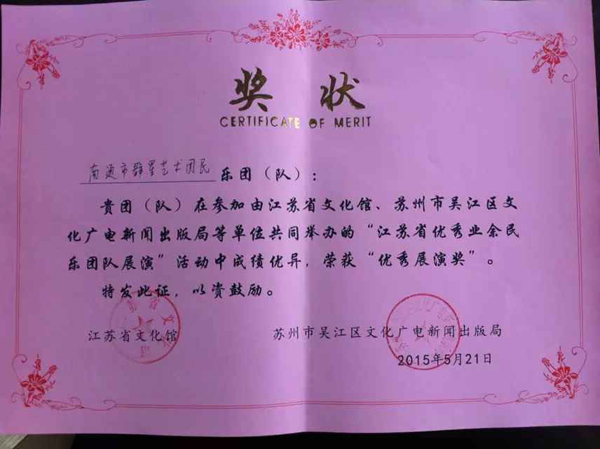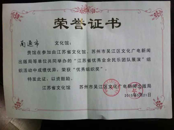 5月20日晚,江苏省优秀业余民乐团队展演在吴江人民剧院举行,共有来自全省的19支优秀业余民乐团队、500多人参演,参演的曲目中既有传统民乐改编曲目,也有不少新创作的优秀作品,地域特色突出、风格各异而又精彩纷呈。通过激烈角逐,南通市群星艺术团民乐团创作表演的《暖春》获优秀展演奖,南通市文化馆获优秀组织奖。我馆有五名同志参加了乐队比赛。